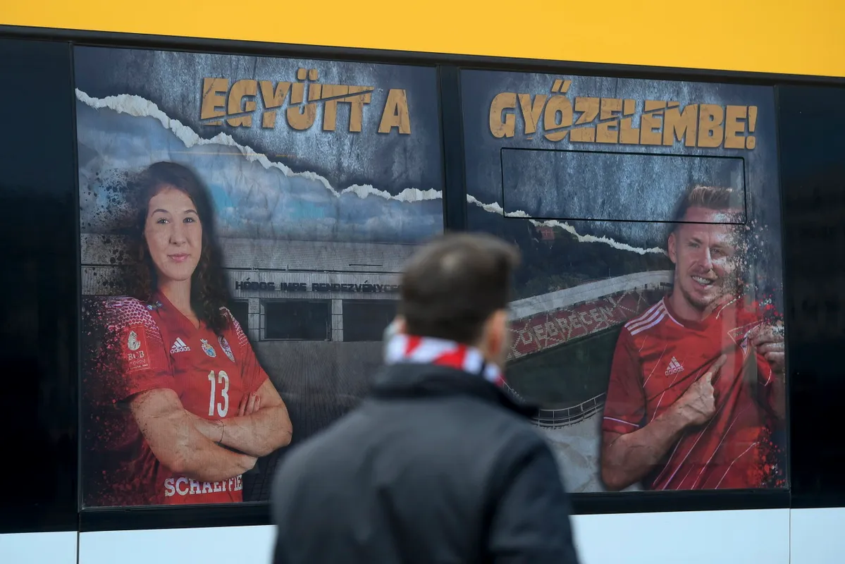A piros-fehérbe öltöztetett szerelvényen a DVSC kézilabda- és labdarúgócsapatának címerei mellett szurkolói életképek és játékosportrék láthatóak – utóbbiak között Dzsudzsák Balázsé is.
