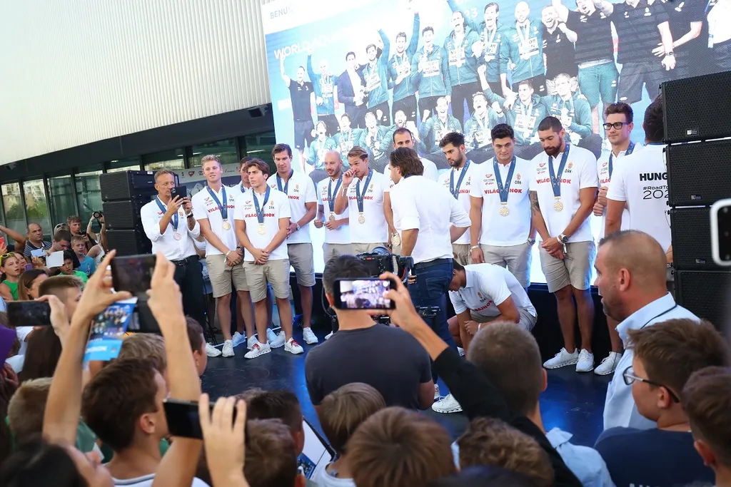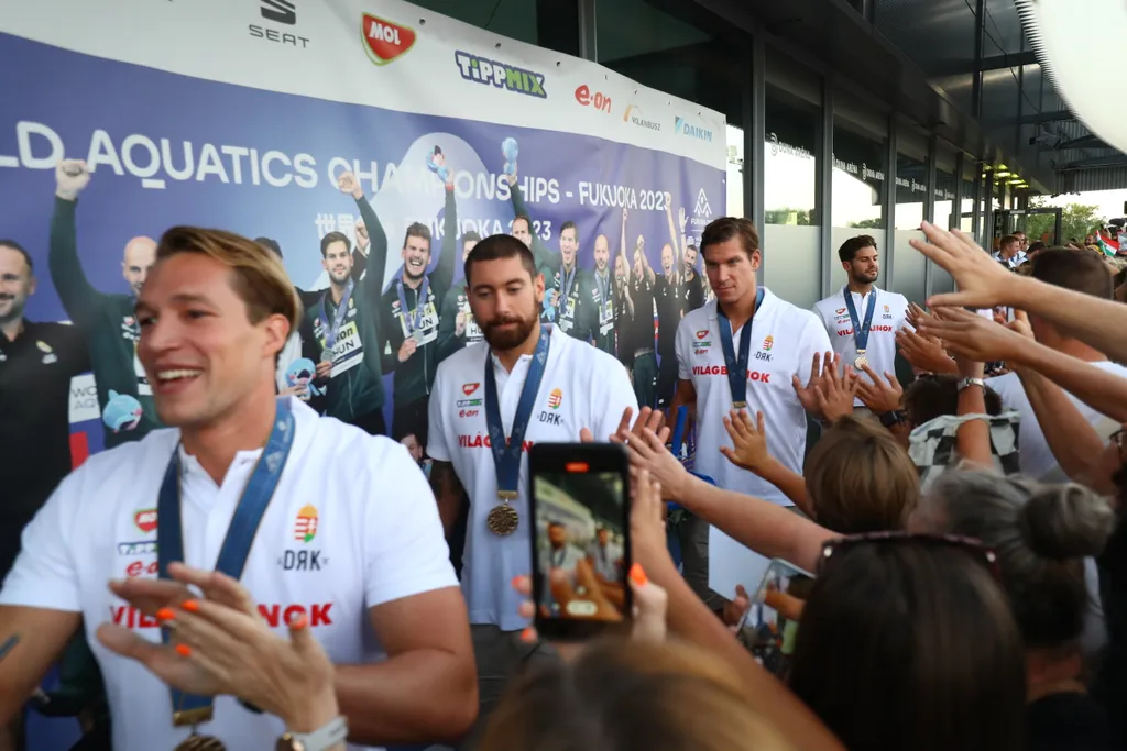 Hétfő este maratoni utazás után hazaérkezett Japánból a világbajnok férfi vízilabdaválogatott. A játékosok a repülőtérről azonnal a Duna Arénába buszoztak, ahol először családtagjaikkal, majd a sajtóval találkoztak, végül a szurkolókkal együtt ünnepeltek.
