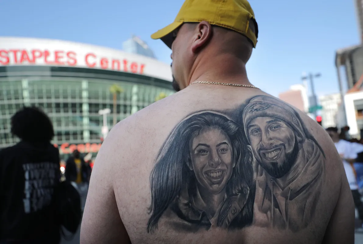 Tetoválás egy rajongó hátán Kobe és Gigi Bryant emlékére
