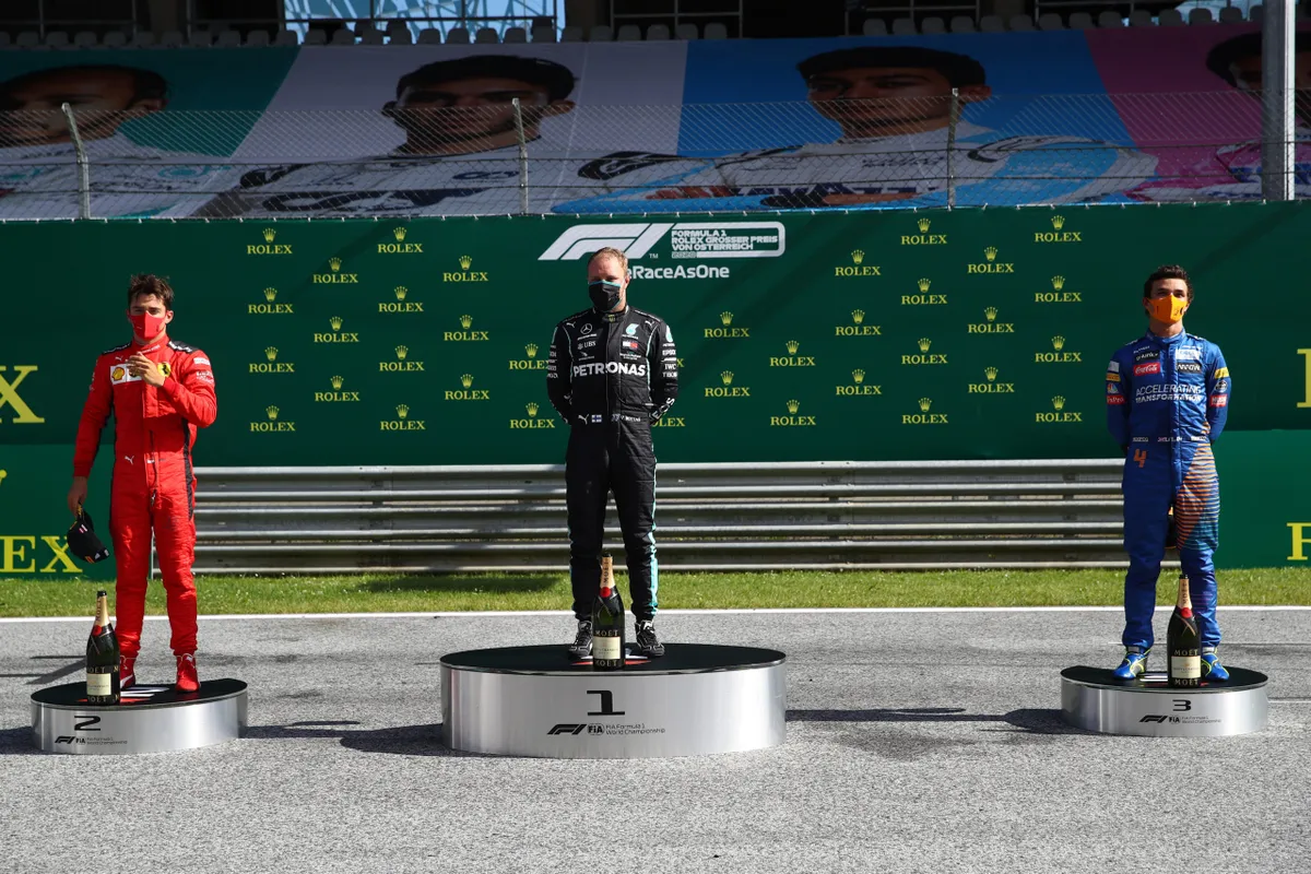 Valtteri Bottas, a Mercedes finn versenyzője nyerte vasárnap a Forma-1-es Osztrák Nagydíjat, amely a koronavírus-járvány miatt különleges óvintézkedések mellett, zárt kapuk mögött zajlott. A második helyen Charles Leclerc (Ferrari), a harmadikon pedig a meglepetésember Lando Norris (McLaren) végzett. Utóbbi élete legjobbja után az ünneplésben már az élen járt.