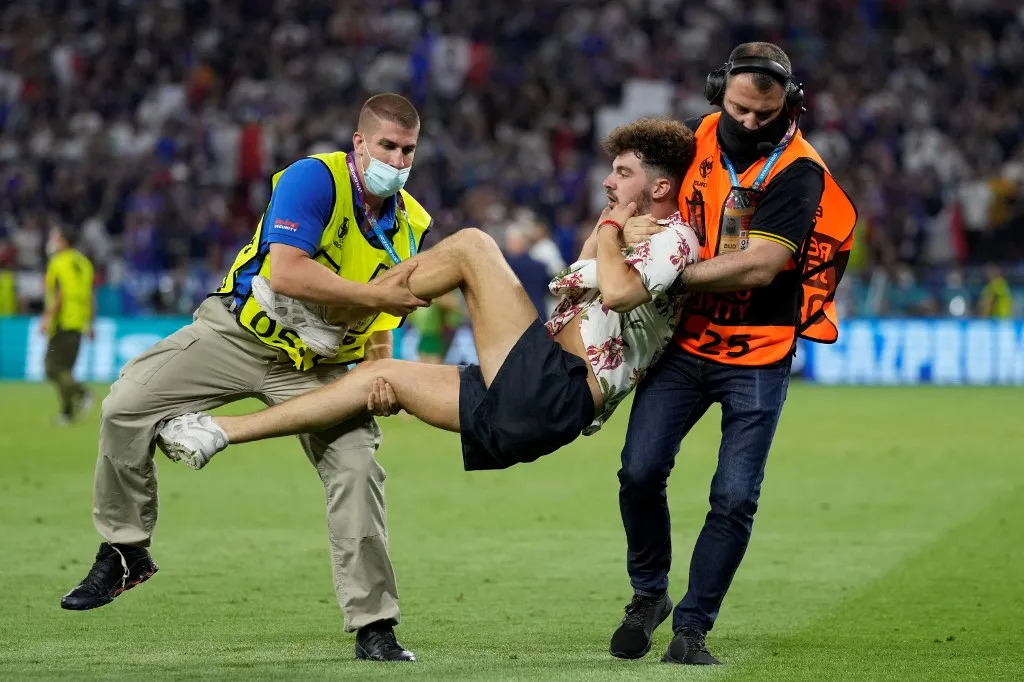 A meccs végén egymás után rohant be négy idióta szurkoló a gyepre, Cristiano Ronaldo, Kylian Mbappé és a többi világsztár felé.