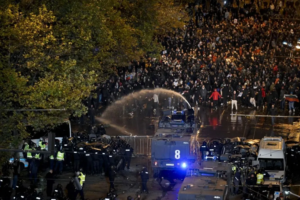 A kezdetben békés szurkolói tüntetés durva fordulatot vett. A rendőrség vízágyúkkal oszlatja a feldühödött tömege - írja az Origo.