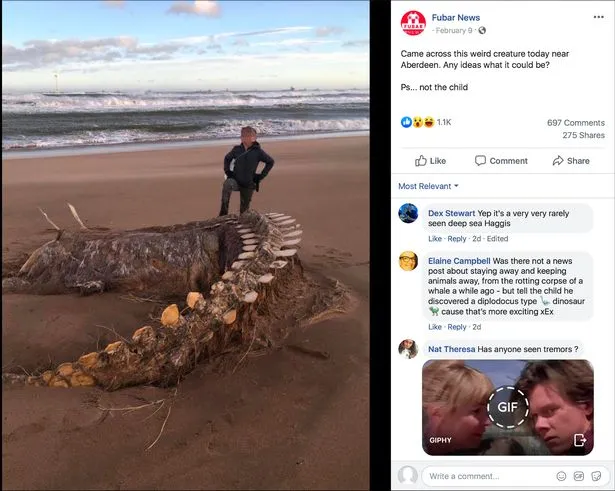 A rothadó tetemről készült képek a Facebookra is felkerültek, a netezők körében pedig egyből beindultak a találgatások. Az élénk fantáziájúak máris arról suttognak, hogy a legendás Loch Ness-i szörny teteme sodródott partra a rendkívül erős, 90 km/h-val süvítő szél miatt.