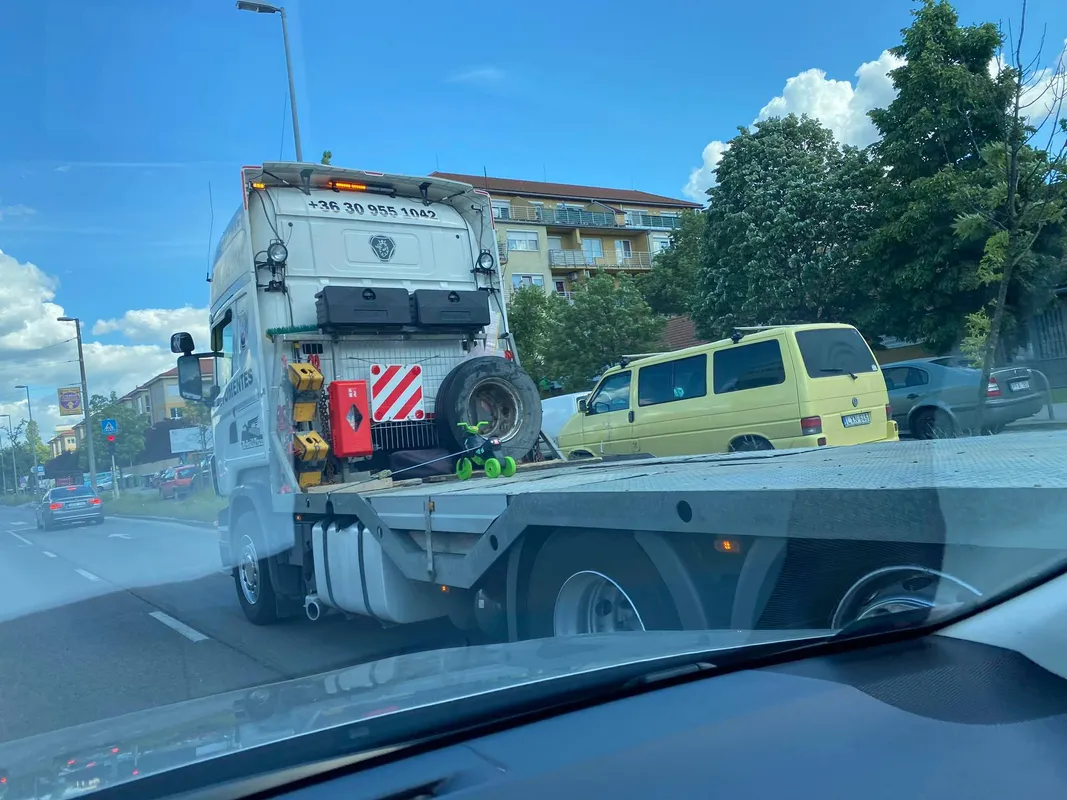 Olvasónk gyanútlanul autózott az egyik délután a Kőbányai úton, amikor is az Eiffel Műhelyház magasságában elhúzott mellette egy nyergesvontató. A meghökkentő szállítmány azonnal szemet szúrt neki; ilyen rakományt még életében nem látott. Azonnal fényképezőgépet ragadott, hogy megörökítse a nem mindennapi látványt.