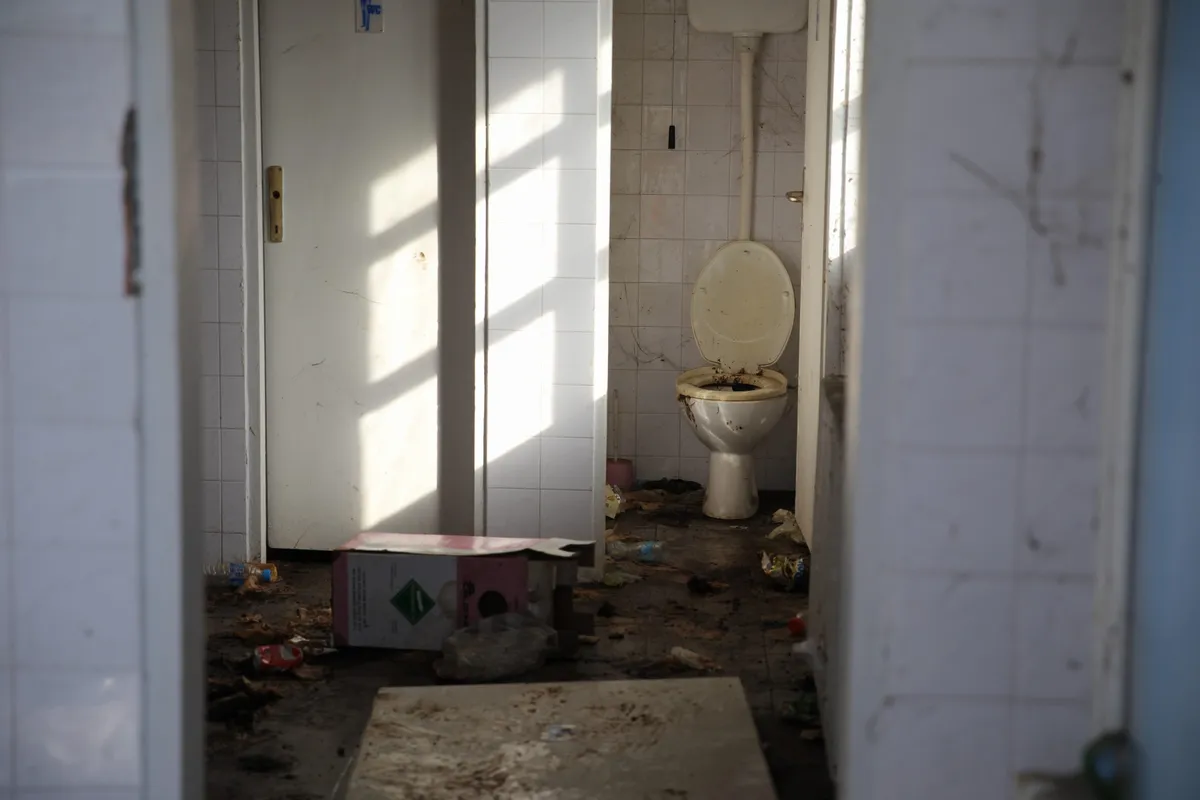 A határon befotóztunk az egyik migránsok által fél napra „megszállt” épületbe – belépni már nem volt gusztusunk, mert hiába a vécé, körben a földön mindenhol ürülék volt. A kép kinagyítását sem ajánljuk senkinek, gyomorforgató...