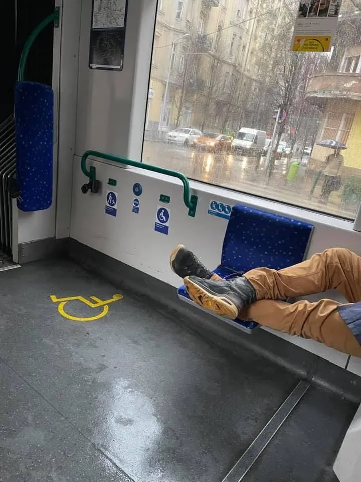 Két helyet foglalt el a 4-6-os villamoson a nap tahója kedden. Nem is akárhogyan, az egyik széken ült, a másikra pedig a saját lábait pakolta fel. Ebben a saras, esős időben ez külön díjazandó... A fiatalembert a Ripost egyik olvasója fotózta el.