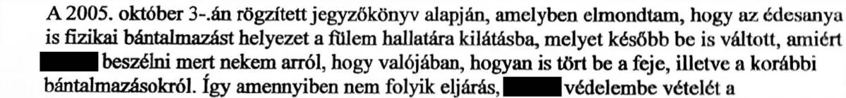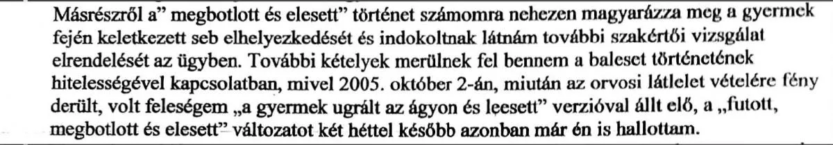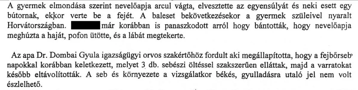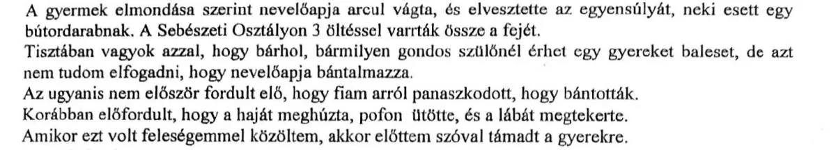 A családgondozóban így számolt be erről az édesapa a Bors által múlt héten nyilvánosságra hozott dokumentumok szerint: „2005. 09. 30-án esedékes láthatáskor kiskorú gyermekemet téli sapkában adta át az édesanyja, és nem közölte velem, hogy fiamat baleset érte. A gyermek elmondása szerint nevelőapja arcul vágta és elvesztette az egyensúlyát, nekiesett egy bútordarabnak. A sebészeti osztályon 3 öltéssel varrták össze a fejét... nem tudom elfogadni, hogy nevelőapja bántalmazza.”