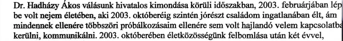 „Dr. Hadházy Ákos ...2003 februárjában lépett be volt nejem életébe… Új házasságkötését követően tovább erősödött volt nejem azon törekvése, hogy az új apa megjelenésével eltávolítsa a régit… Volt nejem és a jelenlegi férje folyamatosan azon fáradoznak, hogy a gyermekkel kapcsolatos jogaimat minimálisra korlátozzák… Továbbra is fenntartom azon állításomat, hogy gyermekem szavának hiszek és őt fizikailag bántalmazták...” – írta az édesapa.