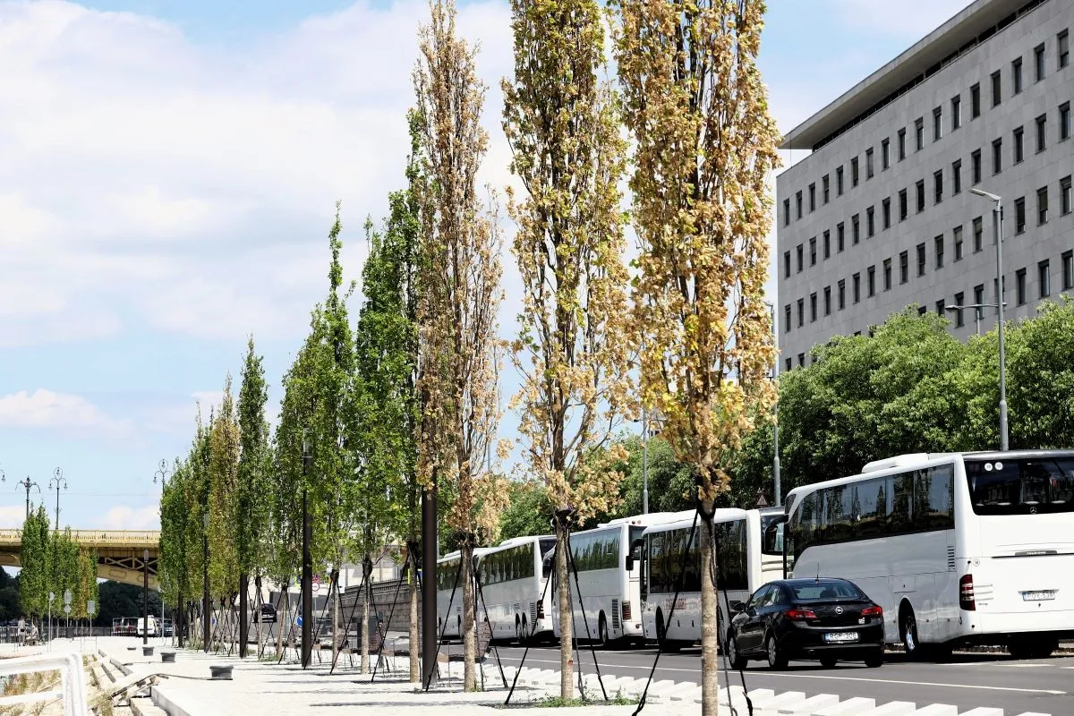 Teljes káosz, a frissen telepített fasor kb. negyede haldoklik a végleges lezárás előtt álló pesti alsó rakparton.