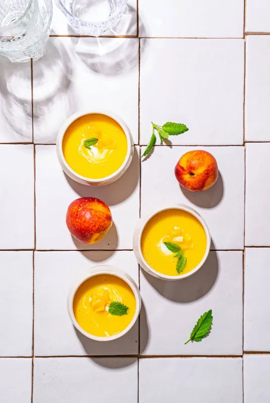 2. Adagoljuk tálkákba a hűs levest, díszítsük a tetejét a félretett mangó- és barackkockákkal, valamint némi görög joghurttal és citromfűlevelekkel.