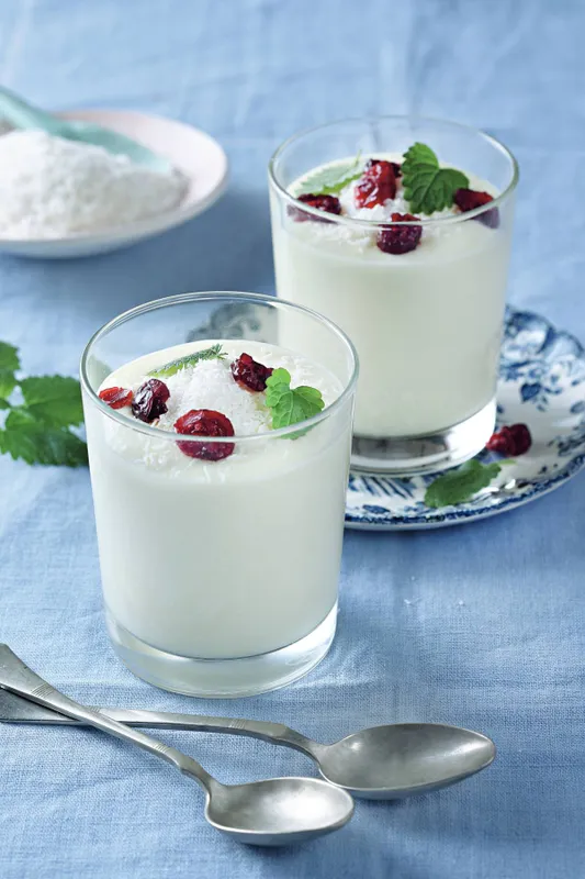 3. Adagoljuk a krémet 4 db pohárba, és folpakkal lefedve tegyük a hűtőbe tálalásig. Némi kókuszreszelékkel megszórva, továbbá egy kevés aszalt áfonyával és néhány citromfűlevéllel díszítve tálaljuk.