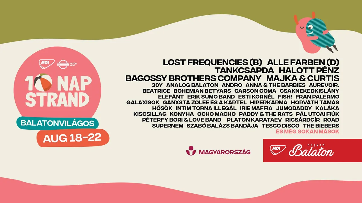 Zamárdi helyett idén Balatonvilágoson, 4 helyett 10 napig várja a szórakozni vágyókat a “10 NAP STRAND” fesztivál, a MOL Nagyon Balaton 2013 óta sikeres eseménye. „Kisebb lesz, hosszabb és a megszokottnál is kedvesebb” – ígérik a szervezők. Két színpad, tábortűz, kertmozi, előadások, beszélgetések és vízparti játékok, valamint száznál is több zenekar és dj várja a közönséget. A nemzetközi kínálatból elsőként a Lost Frequencies és Alle Farben érkezését jelentette be a szervező VOLT Produkció, a hazai kedvencek közül pedig a teljesség igényével találkozhatunk a 10 nap során: mindenki itt lesz, akit az elmúlt években fesztiválok nagyszínpada előtt várt volna a közönség. A STRAND Fesztiválra korábban megvásárolt jegyek tulajdonosai kedvezményesen válthatnak jegyet a 10 NAP STRAND-ra.