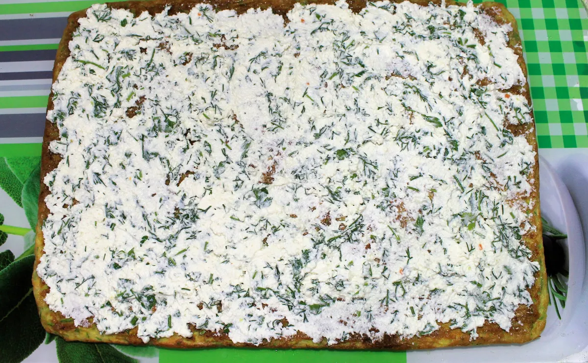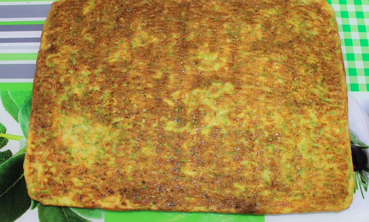 • A cukkinis masszát simítsd egy sütőpapírral kibélelt tepsibe úgy, hogy egy kb. 20x25 cm-es lapot kapj.