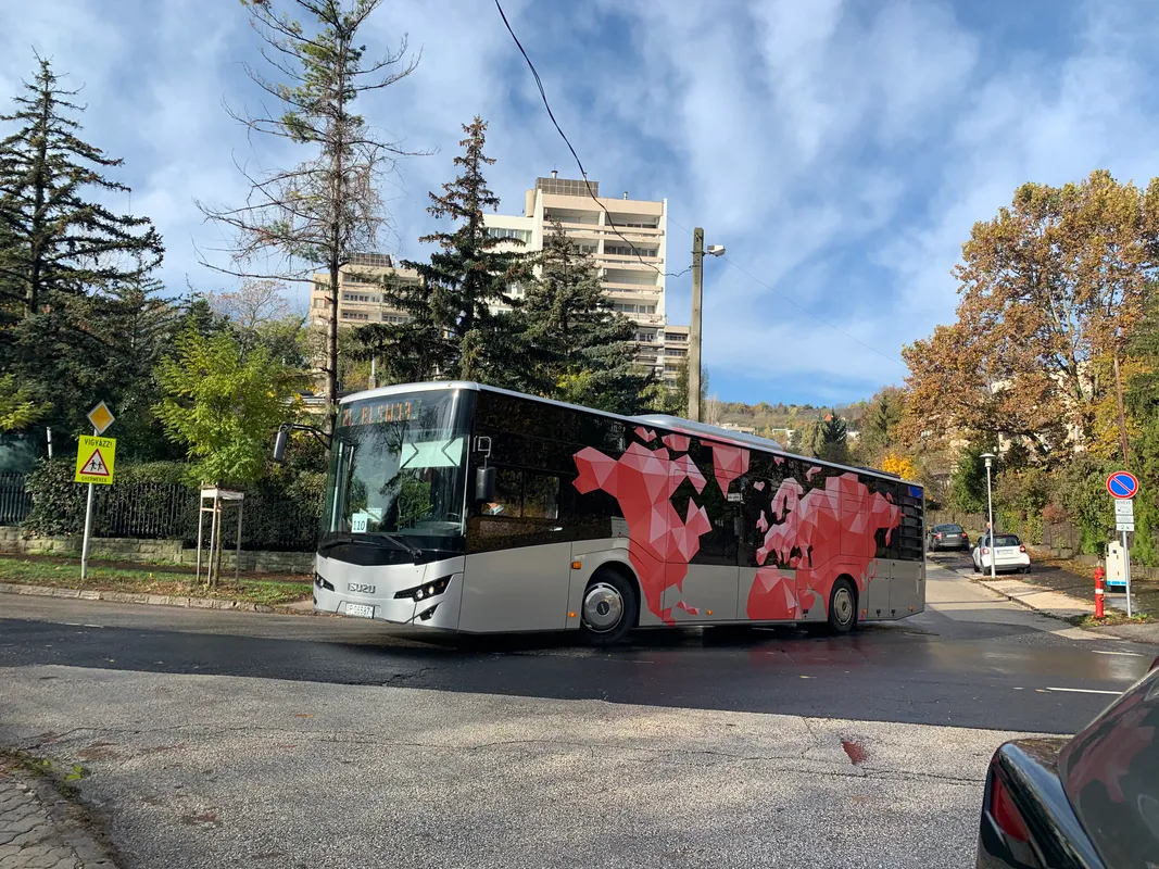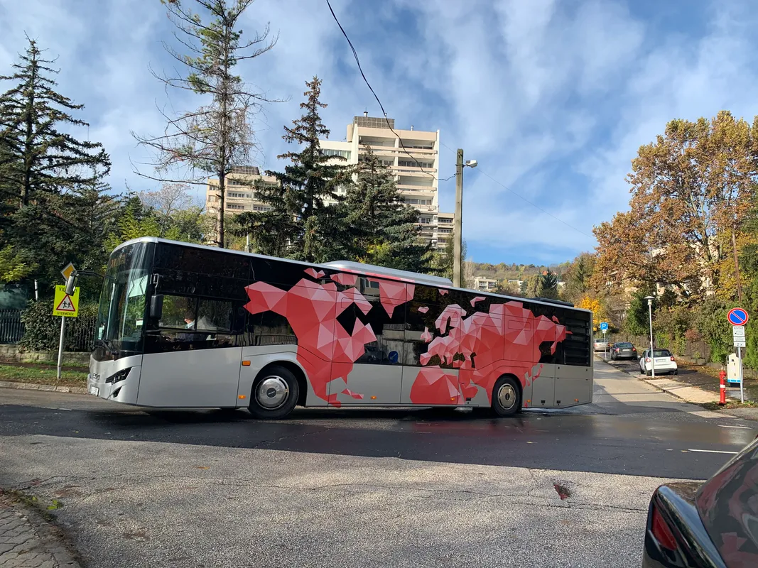 Nem hittek a szemüknek ma reggel az utasok a 12. kerületi megállóban. A megszokott időben ugyanis nem a szokásos kék busz érkezett, hanem egy rendkívül feltűnő, ezüst jármű, amin hatalmas rózsaszínű, elnagyolt világtérképet ábrázoló matrica is látható volt.