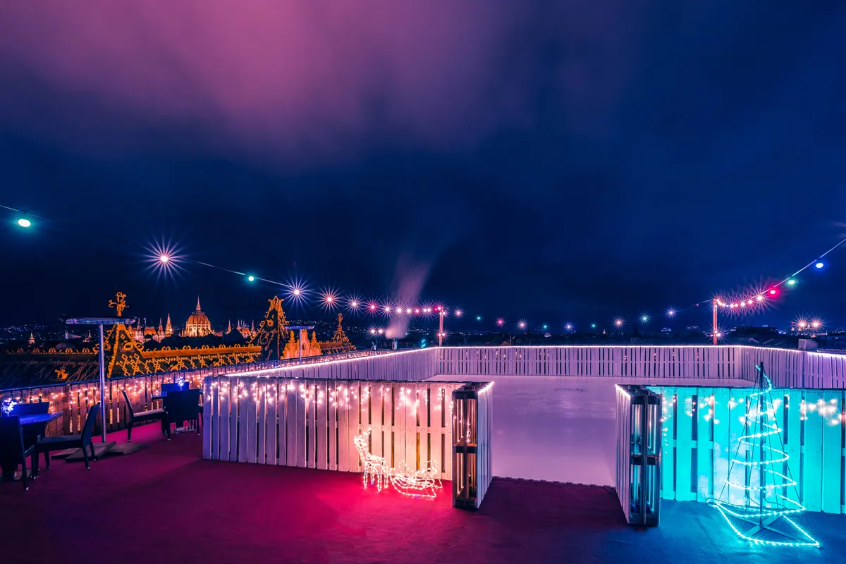 Hétfőn újra megnyitott a főváros legkülönlegesebb panorámájával rendelkező jégpályája a belvárosi Hotel President tetején.