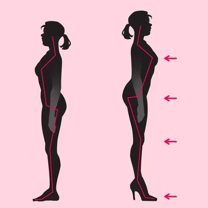 Derekad előredől, éppen az egyensúly megőrzésének érdekében történik ez, mégis könnyen vezet lordózishoz, fájós derékhoz, amely sokkal kellemetlenebb később és hosszabb távon, mint amekkora örömöt okoz egy tűsarkú a lábadon.