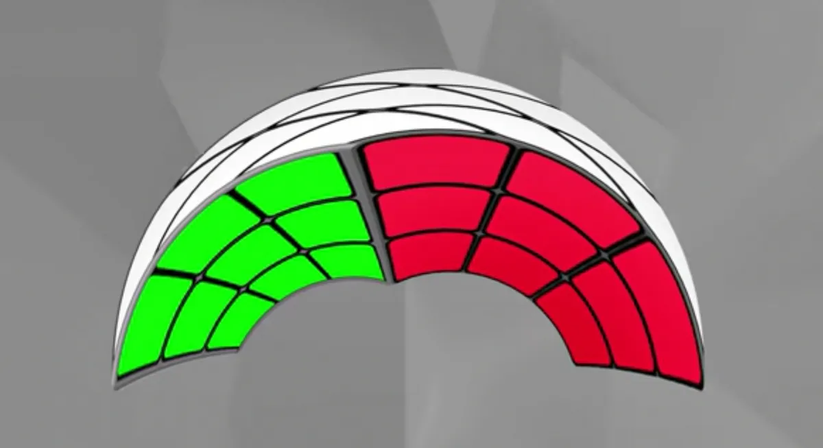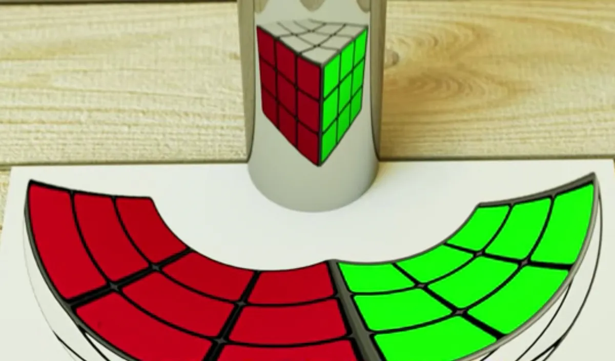 Ha alaposan megnézted az előző rajzot, és felfedezted rajta a négyzetrács jellegű mintát is, akkor jó esély volt rá, hogy a Rubik kocka ugrik be róla neked is. És nem is tévedtél! Ha ugyanis egy ilyen rajz elé egy gömbölyű trükröt rakunk, akkor nézd csak, mit mutat a tükör...:
