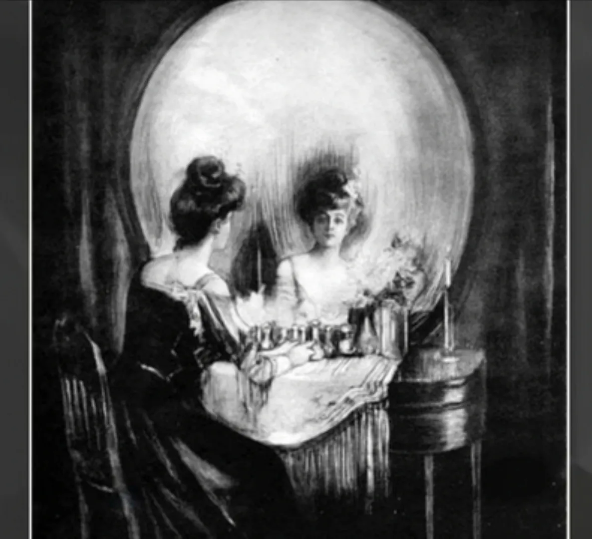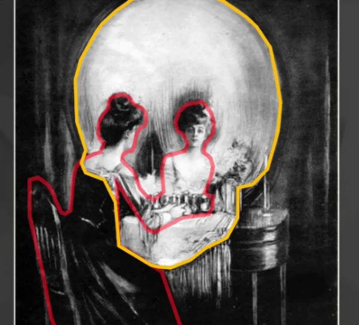 A kép érdekessége, hogy egyszerre két dolgot is felfedezhetsz rajta. Az egyik forma a női alak, amely a tükörben nézi önmagát. A másik forma pedig egy koponya. Neked is feltűnt? Észrevetted mindkettőt? Ha az összes feladatot hibátlanul oldottad meg, akkor igazán elégedett lehetsz magaddal! Ha pedig esetleg kifogott rajtad valamelyik, ne csüggedj: az emberek többségét megtréfálja legalább az egyik ezek közül.