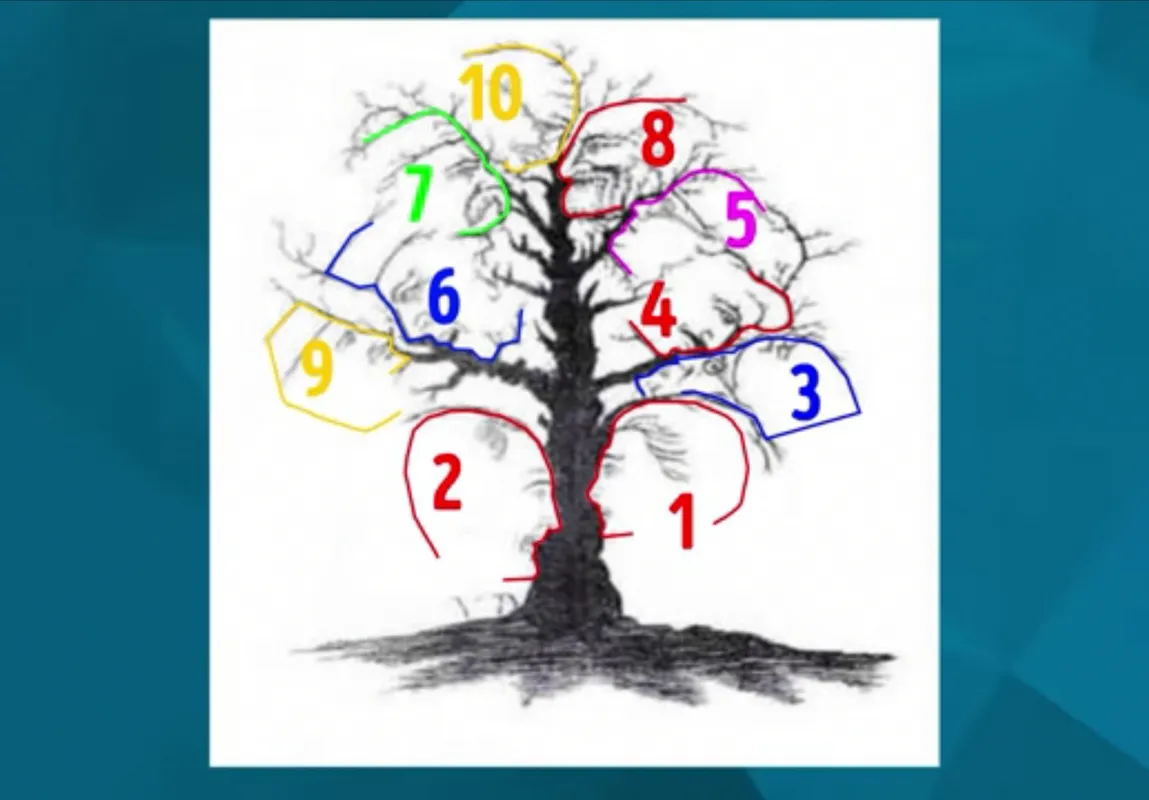 Jöjjön a következő rajz. Ez sem kevésbé izgalmas, sőt! Első ránézésre szinte minden ember felfedez rajta négy arcot. De ha alaposabban szemrevételezed, akkor vajon neked mennyi arckép rajzolódik ki rajta?