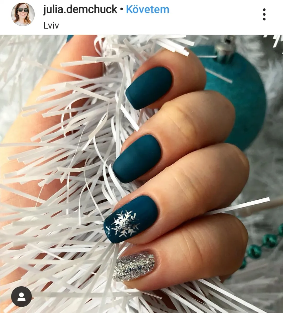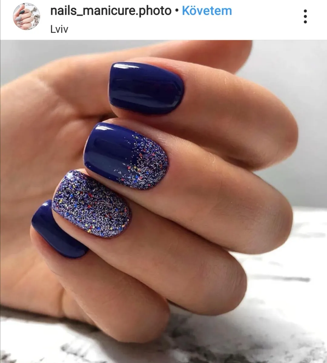 Továbbra is tartja dobogós helyét a kék szín és annak szinte minden árnyalata. Ez a sötét tónus, melyet a képen láthatsz, eszméletlenül jól mutat az apró csillámos díszítéssel.