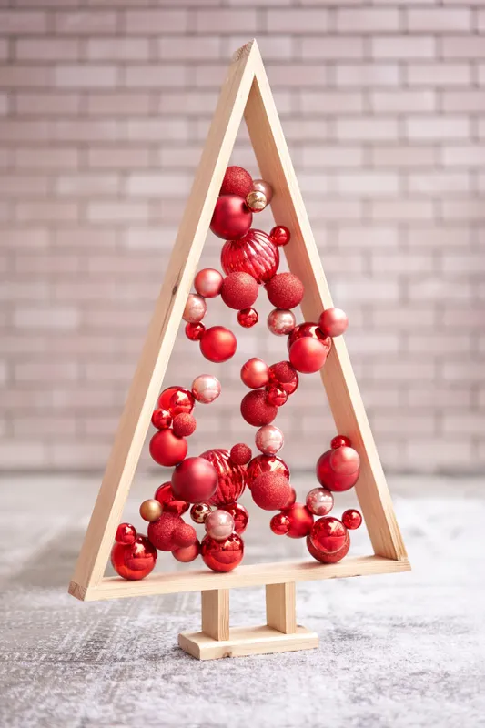 3. Engedd szabadjára a fantáziád! Készíts fából karácsonyfa formát. A gömböket, pedig helyezd belülre.