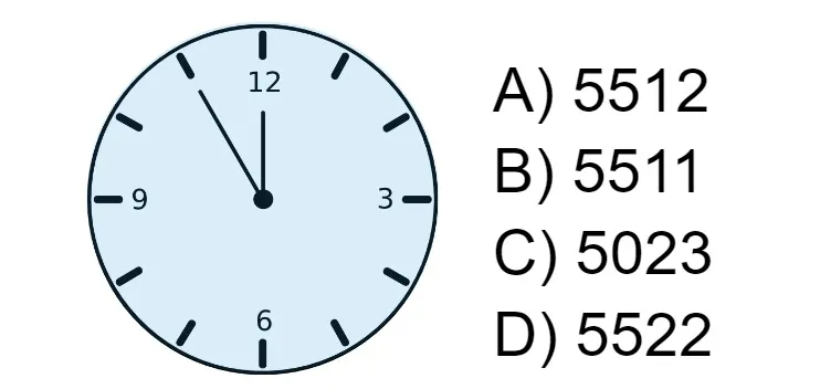 A helyes válasz nem más, mint a B. Az óra ugyanis 11 óra 55 percet mutat. A számokat egymás mellé rakva a 1155 számsor látható, ha pedig felcseréled a percet és az órát szimbolizáló számokat, akkor 5511 lesz a szám, amit kapni fogsz.