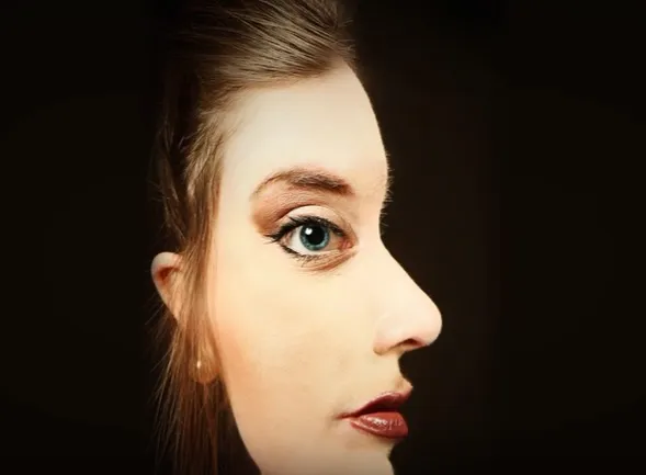 Két különböző értelmezést is kaphat ez a kép. Vizsgáld csak meg alaposan. Egyik pillanatban úgy tűnik, mintha egy nő arca látszana rajta szemből, mely félig el van takarva. Második ránézésre pedig ugyanez a nő látszódik, csak éppen oldalról ábrázolva...