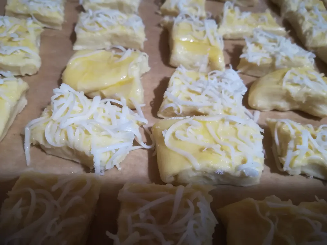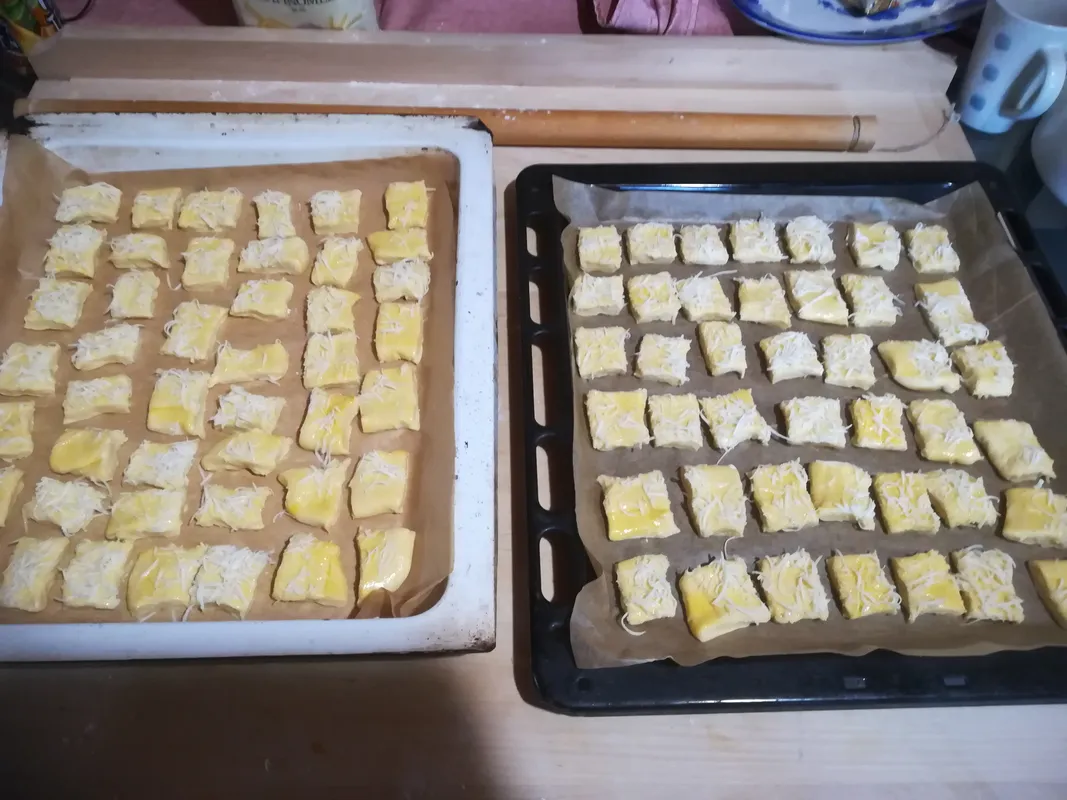 • A tésztát nyújtsuk ki, majd hajtogassuk össze. Ismételjük meg a műveletet még kétszer. Végül 1 cm vastagságúra nyújtsuk ki a tésztát és pogácsaszaggatóval szaggassuk formára. Ha késsel felkockázzuk, úgy is jó.