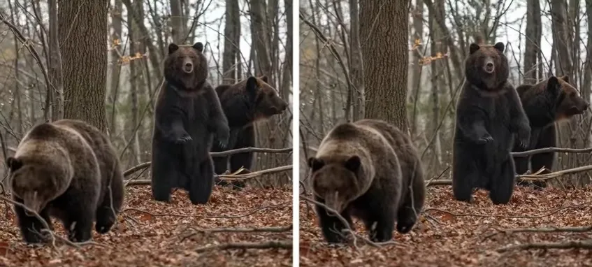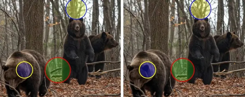 Csakhogy az egyik mackó füle hiányzik, az egyik gally rövidebb, ezen kívül az egyik, földön heverő faág csonka a második képen, nem úgy, mint az elsőn.