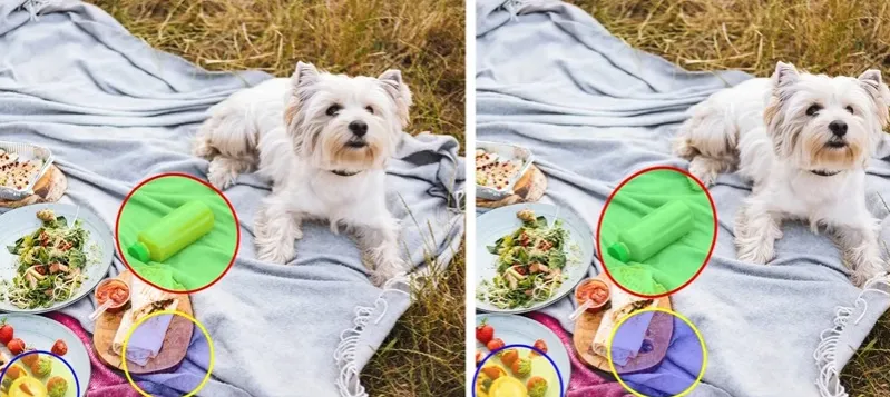 A két fotón más-más színű a palack, illetve két tányéron is felbukkan egy kicsi, de mégis szemmel észrevehető különbség.