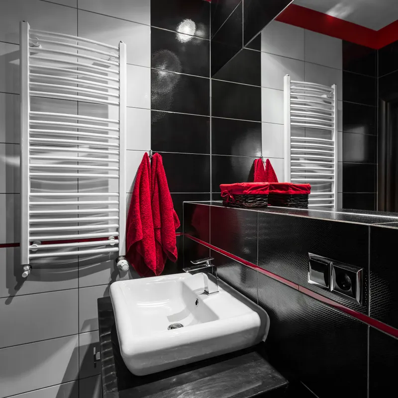 Ha összeállt a feketére hangolt fürdőszoba, vegyünk bele piros törölközőket, fantasztikus lesz az összhatás! Ezzel nem lehet hibázni!