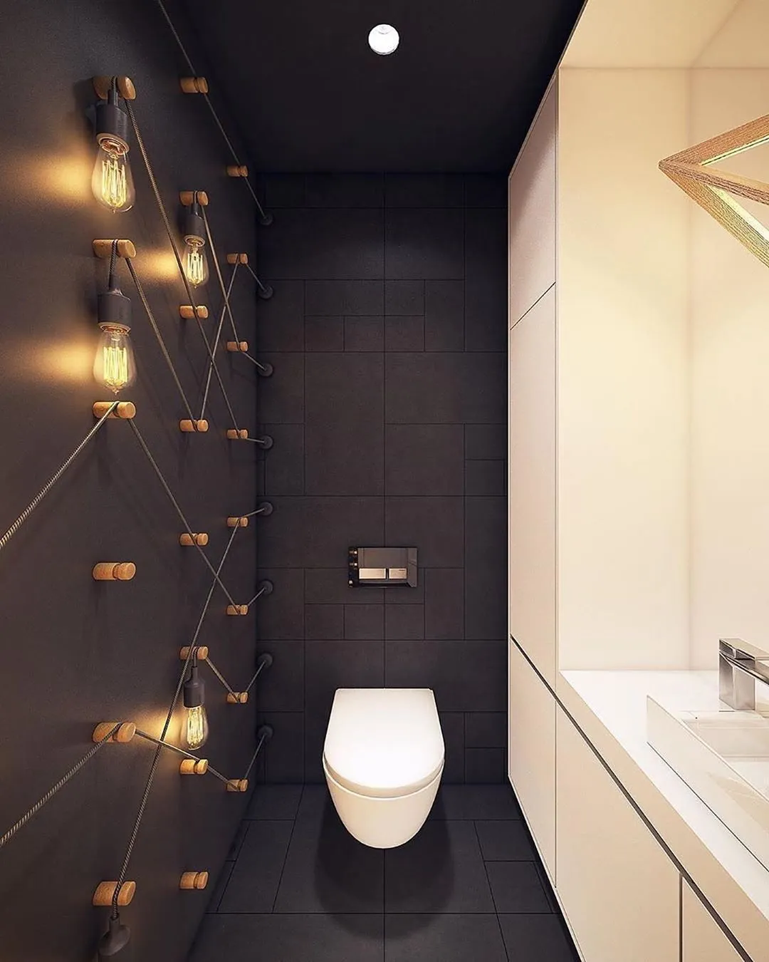Sokszor a vécé okozza a legtöbb fejtörést, hiszen kicsi a hely, néha még az ajtót is alig lehet kinyitni. Szokták mondani, hogy világosra kell festeni, mert növeli a teret. Ne dőljön be ennek senki, itt van ez a remek példa: a nagy szürkeségben a világítás megoldása adja az izgalmat. Micsoda fantasztikus, igazán férfias ötlet!