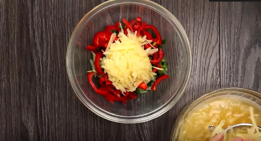 2. Tedd egy tálba a zöldségeket, és csavard ki a burgonyát, azt is helyezd rájuk, majd és sózd, borsozd.