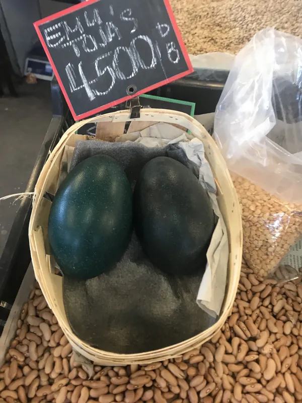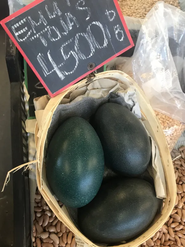 A hatalmas, méregzöld tojások egy kosárkában lapultak, onnan mosolyogtak a vevőkre. Azt, hogy mi is a furcsa portéka, nem volt nehéz kitalálni, hiszen rögtön mögötte egy tábla hirdette: emutojás 4.500 forint!
