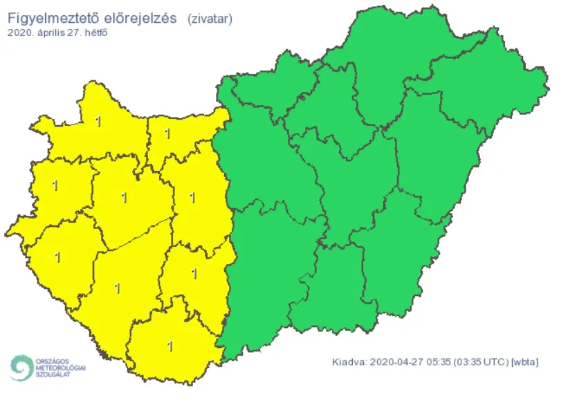 Délelőtt elsősorban a nyugati országrészben lesz több a felhőzet, másutt sok napsütésre számíthatunk, de a délutáni órákban már keletebbre is megnövekszik a gomoly-, illetve fátyolfelhőzet. Délutántól nyugat felől elszórtan valószínű zápor, zivatar. Éjfélig nagyjából a Duna vonaláig juthat el a csapadékzóna. A délies szelet főként a nyugati tájakon élénk lökések kísérik, de zivatarok környezetében erős lökések is lehetnek.Az ország nyugati területén sárga riasztás érvényes.