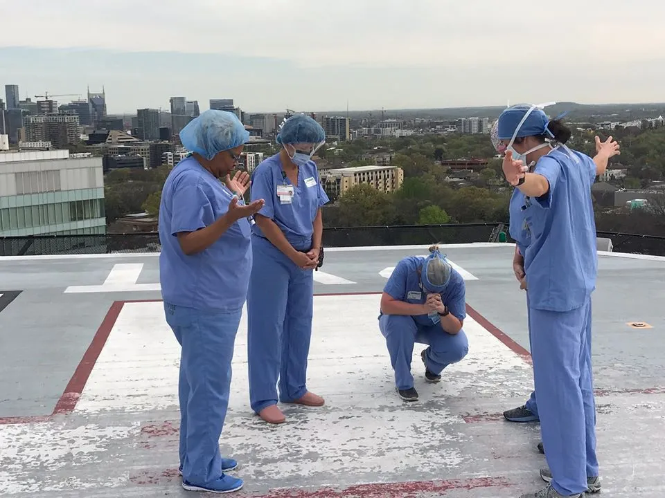 Ahogy a világ minden egészségügyi intézményében, úgy az amerikai kórházakban is éjt nappallá téve azért küzdenek az orvosok és az ápolók, hogy minél több krónikus állapotban lévő koronavírus-fertőzött beteg életét megmentsék. Ezt a drámai harcot talán egy nashville-i kórház, a Vanderbilt Egyetemi Klinikai Központ tetején készült fotó mutatja be a legjobban, amin az látható, ahogy öt ápoló épp Istenhez imádkozik a pár perces pihenőidejük alatt, mielőtt visszamennének az épületbe dolgozni.