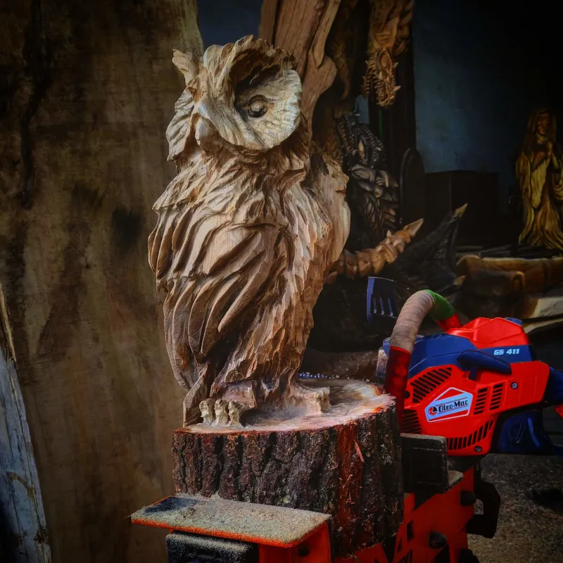 Az elején nem volt könnyű, hiszen Norbert a bizonytalanra hagyta ott az állását. Egy valamit tudott: fát akart megmunkálni. „Olyat akartam csinálni, ami nincs, ami különleges, kutattam ötletekért az internetet. Így akadtam egy YouTube videóra, amin egy kanadai fickó láncfűrésszel belefaragta egy mamutfenyőbe az erdő szellemét. Nagyon megtetszett, kész voltam! Beleástam magam a témába, de letaglózott, amikor kiderült, milyen drága az a fűrész, amivel szobrokat lehet faragni. Szerencsére ráakadtam egy megoldásra, ami az egyszerű háztartási fűrészt is alkalmassá teszi a műveletre. Emlékszem, szakadt a hó, amikor leesett a tantusz, és én azonnal szaladtam kipróbálni a módszert. Így készítettem el életem első bagoly szobrát. Eszméletlen boldoggá tett!”