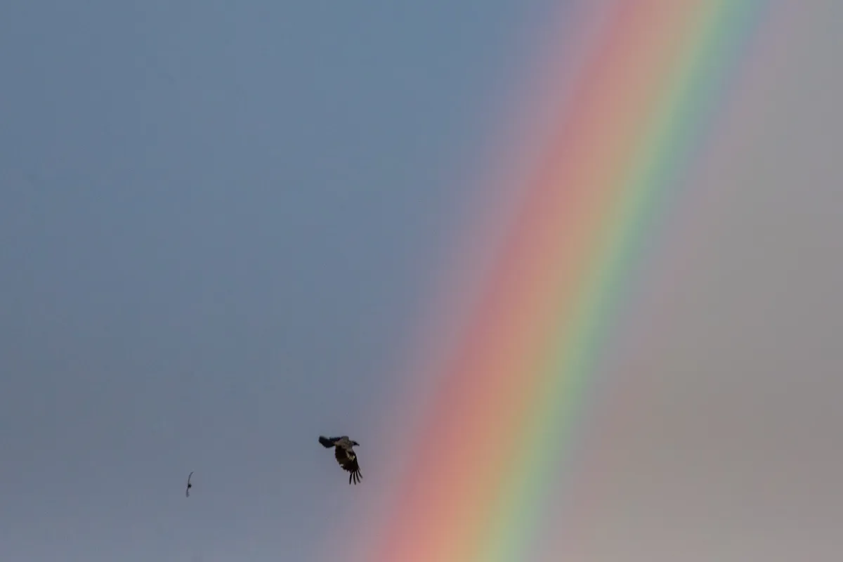 Igazán ritka, hogy ennyire élesen látszódjanak a szivárványban az egymástól elkülönülő színsávok. Alábbi képünk azt a pillanatot örökíti meg, amikor éppen úgy szállt a lakótelep fölött egy madár, talán varjú, mintha csak a szivárványban akarna megfürödni. Talán így volt, talán nem...