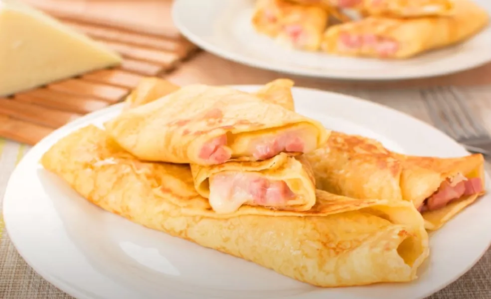 3. A kész palacsintákat tedd egy tányérra. A palacsinta felére szórd rá a sajtot, a sonkát és tekerd fel.