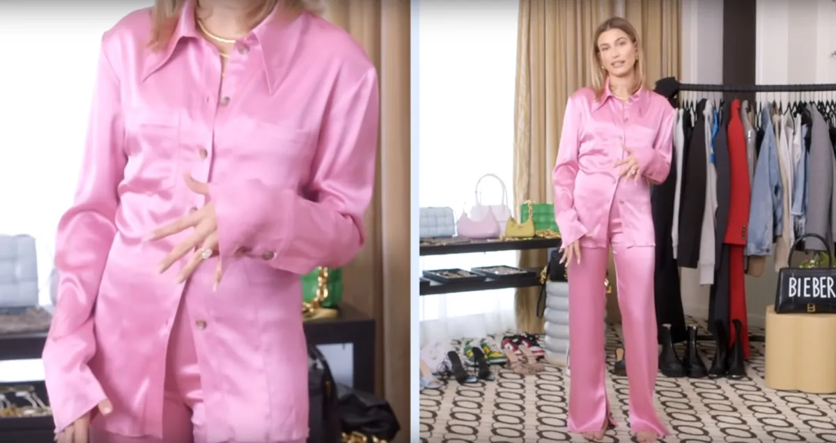 Az utóbbi hetekben pedig főként egy rózsaszín ingből és nadrágból álló szett hódít a világhírű hölgyek között. Először a már veterán Nanushka-rajongónak számító Hailey Bieber mutatta be a Vogue magazin videójában, mint a kedvenc otthoni viseletét.