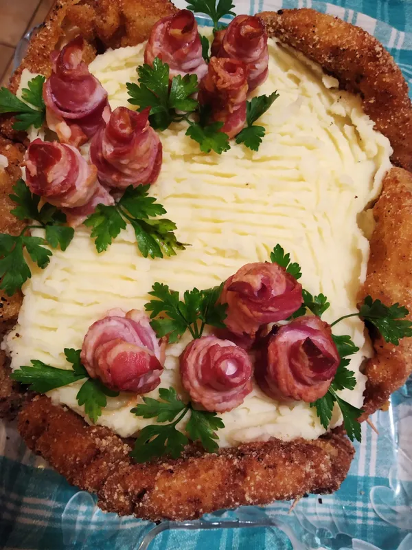 Összeállításkor egy peremes tál oldalához igazította körben a rántott hús szeleteket. Hogy megtartsák a formát, fogpiszkálóval összetűzte őket. A torta közepét feltöltötte krumplipürével, erre ültette rá a ropogósra sült szalonnarózsát. A rózsák köré petrezselyemlevélből rakott díszítést. Egyszerűen zseniális!