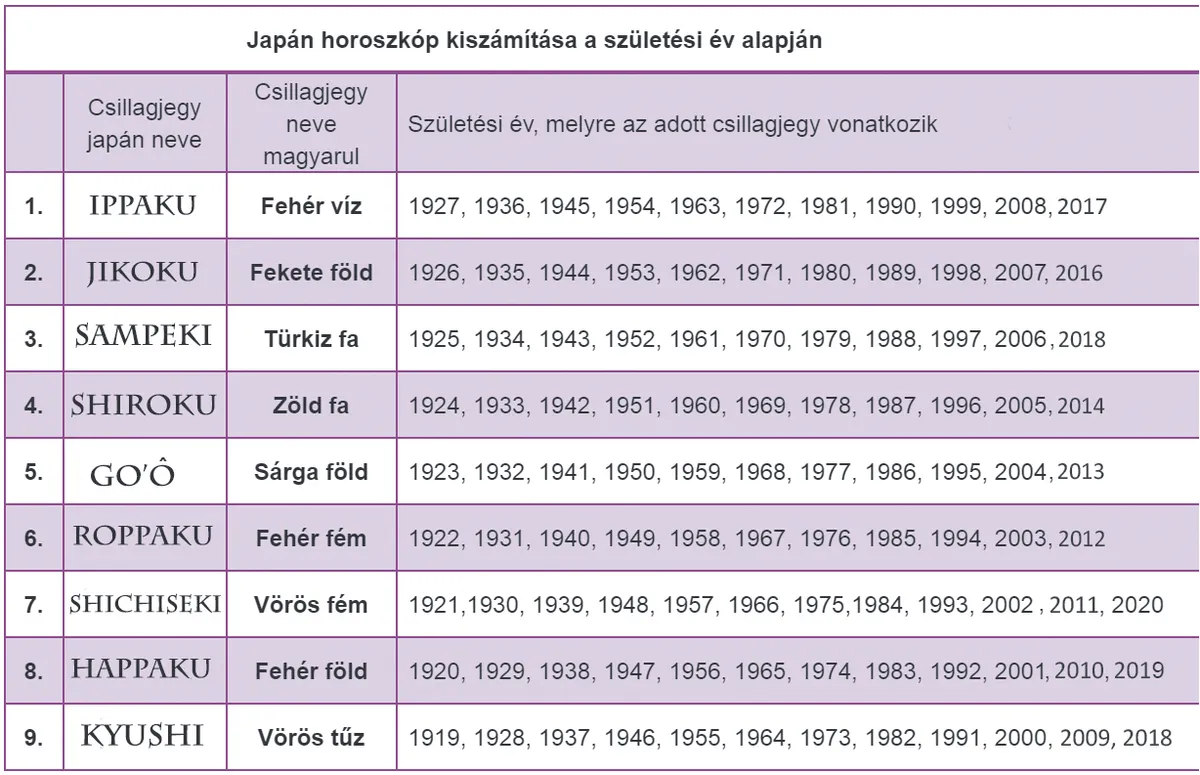 A misztikus japán horoszkóp az általunk megszokott hagyományos 12 csillagjeggyel szemben mindössze 9 zodiákust használ. Az ő rendszerük szerint a személyiség alakulására a születési év van hatással. A japán zodiákus jegyekhez rendelt évszámokat az alábbi táblázatban találod.