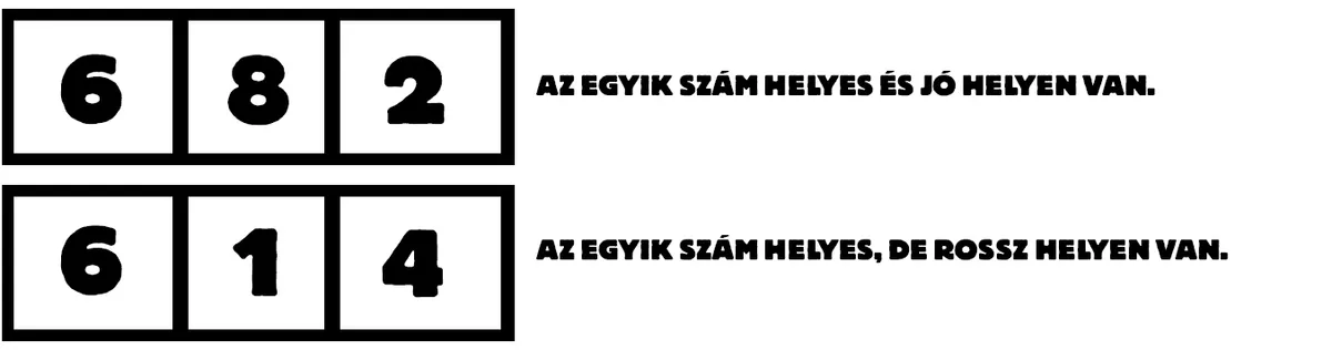 Már majdnem jó úton jár, aki szerint a megoldás 0, 1, 2. Hiszen a második sorból kiderül, hogy az egyik szám biztosan kell a kódhoz. A 6-ost korábban kizártuk, marad az 1-es meg a 4-es. Vegyük előbb az 1-est, hiszen logikusnak tűnhet, hogy valaki emelkedő számsorrendben ad meg egy lakathoz tartozó kódot. Csakhogy a 0, 1, 2 számsorrend mégsem a jó megoldás! Mégpedig azért nem, mert a második sor azt mondja: „az egyik szám helyes, de rossz helyen van”. Ha az 1-es jó szám lenne, akkor az első vagy a harmadik ablakba kellene kerülni, csakhogy az a két hely már foglalt...