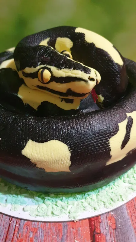 Egy lelkes hobbicukrász, Pozsonyiné Zsuzsi alkotása ez a torta, mely igazán élethű lett, sőt, megszólalásig olyan, mint egy sárga-fekete mintás piton. A kígyótorta belülről sem átlagos: mascarponés, dió ízesítésű krém került bele. Az alkotó kisfia kapta ajándékba és úgy tudjuk, maximálisan elégedett volt vele.