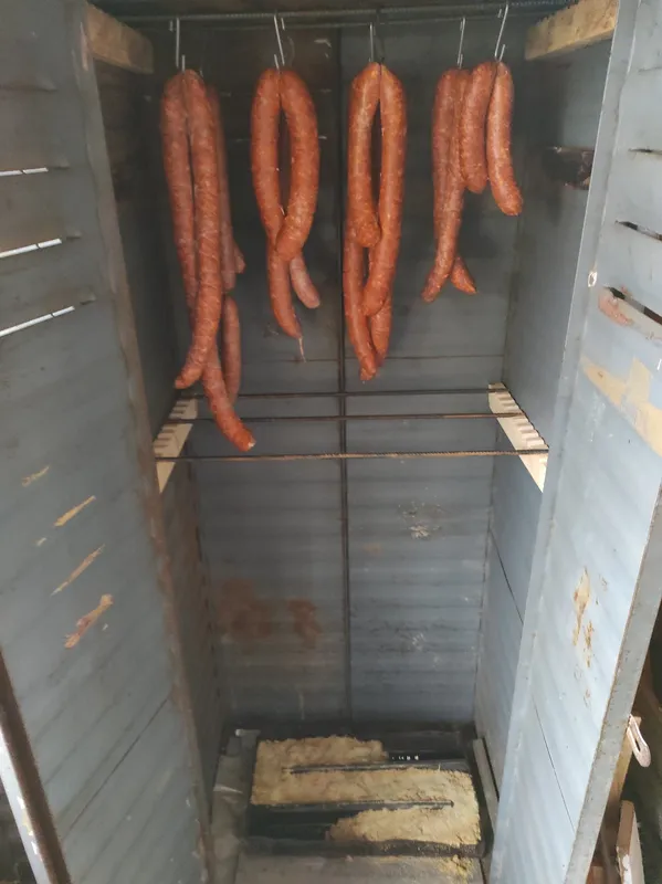 Az idei kolbásztöltéskor jött a felismerés, hogy milyen helyre füstölő alkalmatosság válhatnék a hosszúkás fazonú, háromajtós szekrényből. Sanyi némi fejvakargatást és gondolkodást követően neki is esett a melónak: megszüntetett egy oldalfalat, a korábban egy irányba nyíló ajtókat pedig átigazította, most kettő praktikusan jobbra-balra nyílik, így kényelmesen hozzá lehet férni a belső térhez. Odabentre tartódeszkát csavarozott, erre került a rúd, amiről kellemesen le lehet lógatni a párba kötött kolbászokat, no és a szalonnát.