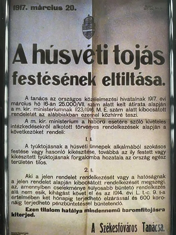 Valójában a rendeletet nem 1917-ben, hanem egy évvel korábban hozták, mint háborús intézkedést. A korabeli újságok rövid közleményekben írtak a Tisza István által aláírt rendeletről, mindössze néhány soros magyarázatot fűztek hozzá. Igaz, enélkül is sejtették az emberek, miért a tilalom: a háború miatt hatalmas volt a szegénység, az élelmiszerhiány, így egyszerűen nem engedhette meg magának az ország, hogy dekorációnak, ajándéknak elpazarolják az értékes tojásokat. A következő év húsvétja sem hozott enyhülést, hiszen még javában tombolt a háború, így a rendelkezést nem vonták vissza. A rendeletet átvette Budapest tanácsa is, és meghozta a maga határozatát. A lapok újra leközölték a szövegét, legfeljebb vigaszként írták hozzá, hogy a locsolkodás nem marad el legalább.