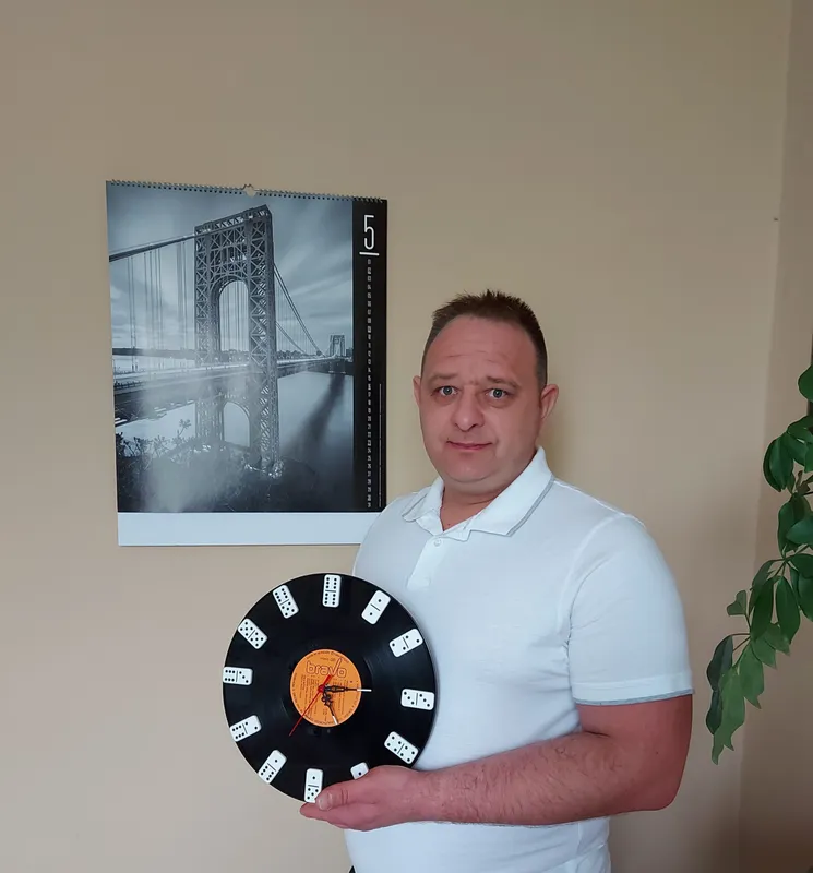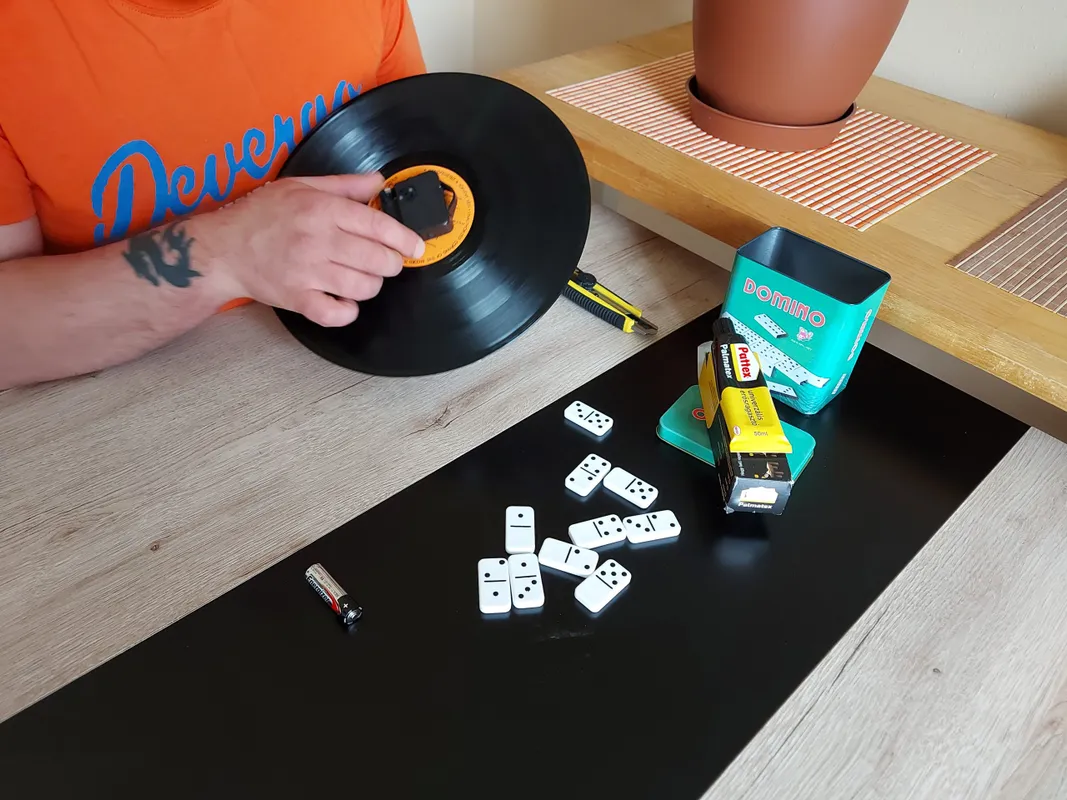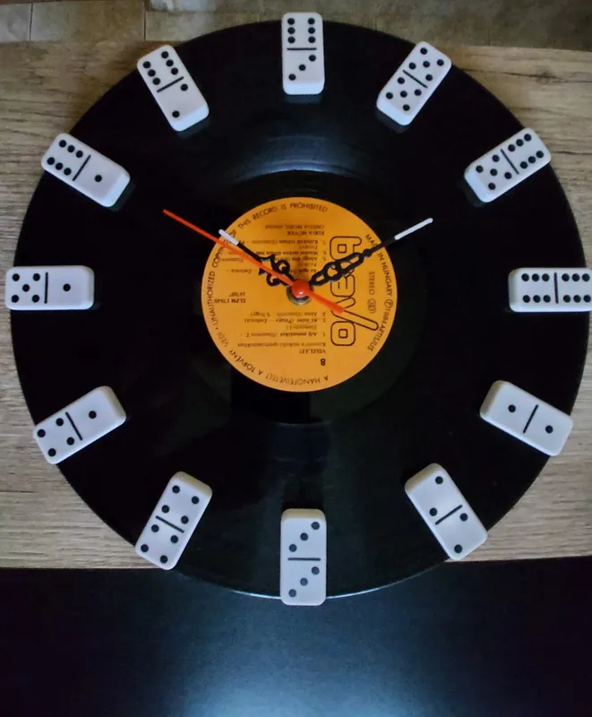 A bakelitlemezből készült óra ötlete egyébként spontán jött. Kérdésünkre az alkotó elmondta, hogy párja már egy ideje rágta a fülét, hogy tegyen egy órát a konyhába, mert főzés közben sohasem tudja, hogy éppen mennyi lehet az idő. „Több lehetőséget is számba vettünk, végül a végső ötlet akkor jutott az eszembe, amikor egyik éjszaka hajnali kettő körül felébredtem. Bevillant, hogy van itthon egy működő óraszerkezetünk meg egy bakelitlemezünk. Szerencsés módon az óramutatókat tartó tengely épp átfért a bakelitlemez közepén található lyukon. Ebből indultam ki. A reggeli kávé mellett neki is láttam a bütykölésnek. Munka közben pedig rájöttem, hogy a számokat fehér dominóval oldom meg, így legalább hasznosan végzi a már hiányos játékkészlet is. Örülök, hogy így összeállt a dolog, de ami a lényeg: páromnak is nagyon tetszik.”