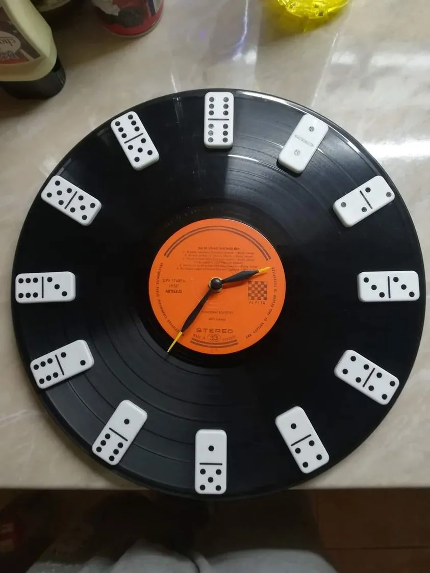 Ötlete egyszerű, de nagyszerű: egy bakelitlemez, néhány dominó és egy működő óraszerkezet segítségével igencsak látványos faliórát dobott össze. Az óra lapja maga a bakelitlemez, melynek a szélére körben fehér színű dominókat ragasztott – ezek az egész órákat jelzik, mégpedig a rajtuk lévő pöttyök száma szerint. A fekete lemezen elképesztően jól mutatnak a fehér dominódarabok – a végeredmény igazán letisztult és meglepően stílusos lett. Ki gondolta volna, hogy ilyen jópofaság születhet a régi bakelitlemezből?