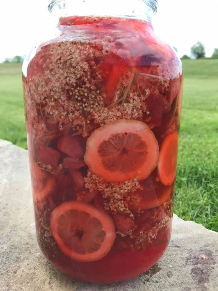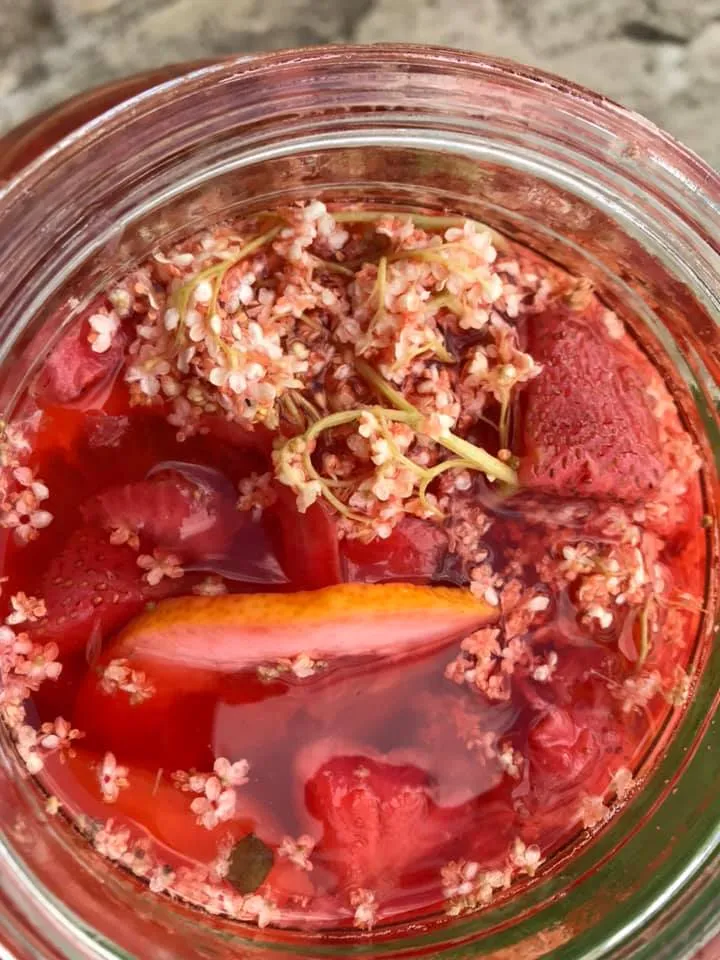 2. Közben vizsgáljuk át a bodzavirágot, a zöld részektől tisztítsuk meg. Semmiképp ne mossuk meg, mert akkor lejön róla az illatos virágpor! A virágfejeket rétegezzük üvegbe a felkarikázott citrommal és a felvágott eperrel.