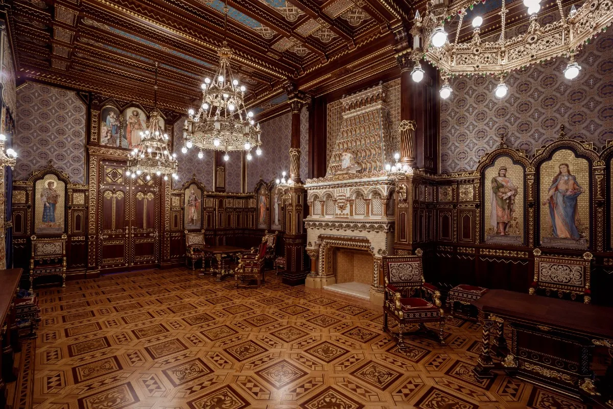 Az újjászületett terem elrendezése, díszítése és bútorzata mindenben a hauszmanni elképzelést követi. A falakat selyemszövet és faragott fa borítja, a bronzdíszeket, a gyönyörű padlót és a kazettás mennyezetet is a legkiválóbb mesterek készítették. A monumentális kandalló az eredetihez hasonlóan a pécsi Zsolnay Porcelánmanufaktúrában készült. A több mint két és fél méter széles, és négy és fél méternél is magasabb kandalló hatszáznál is több elemből áll, párkányát pedig Szent István mellszobra díszíti, amelyet eredetileg a századforduló híres szobrásza, Strobl Alajos alkotott meg. A lélegzetelállító terem helyreállításának értékét növeli, hogy a hitelesség érdekében mára már eltűnőben lévő mesterségek képviselői vettek részt az újraalkotásban: Pécstől Pápáig hét szakma képviselői, országszerte mintegy húsz műhelyben több száz szakember.